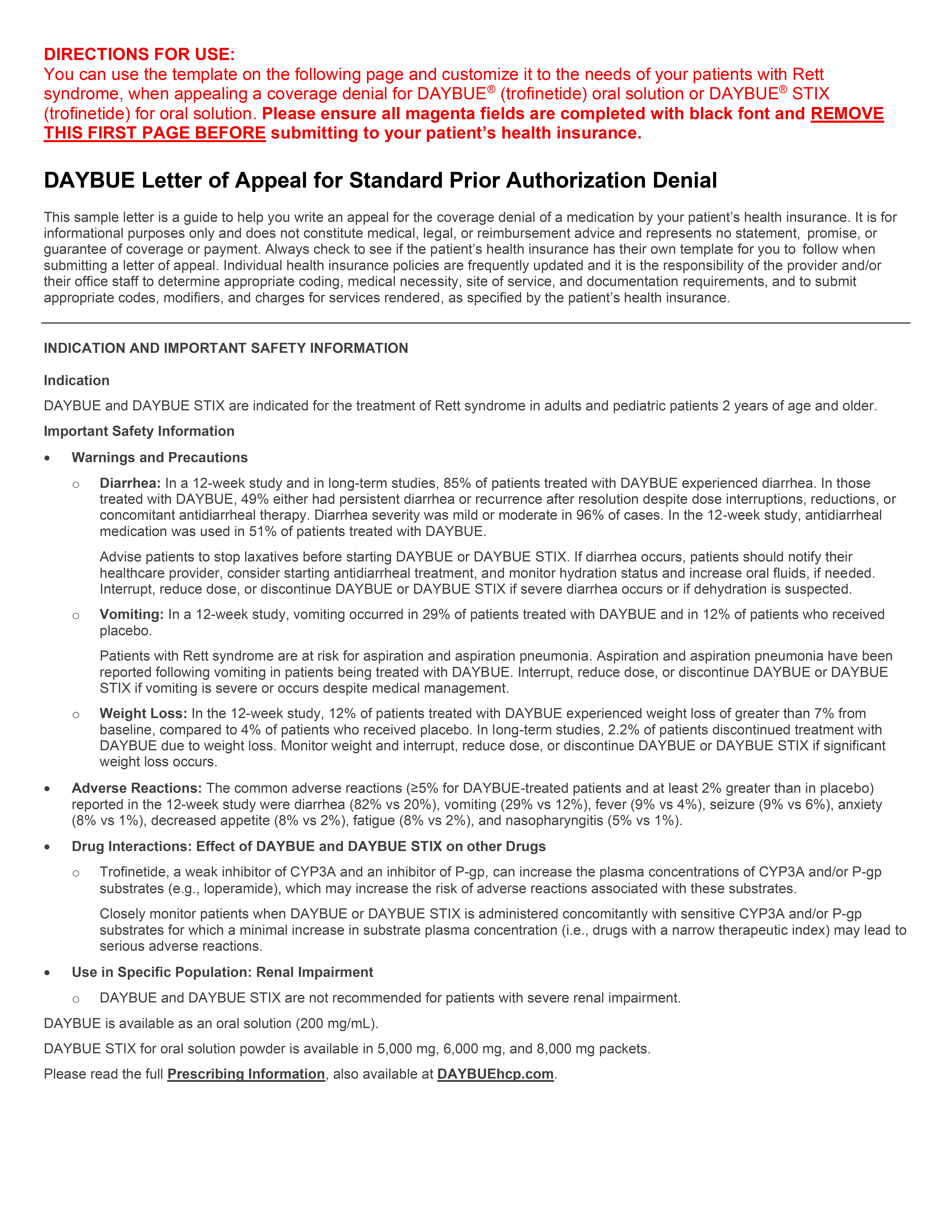 A letter template for your patient’s caregiver to request a reversal of the health plan’s coverage denial for DAYBUE or DAYBUE STIX.