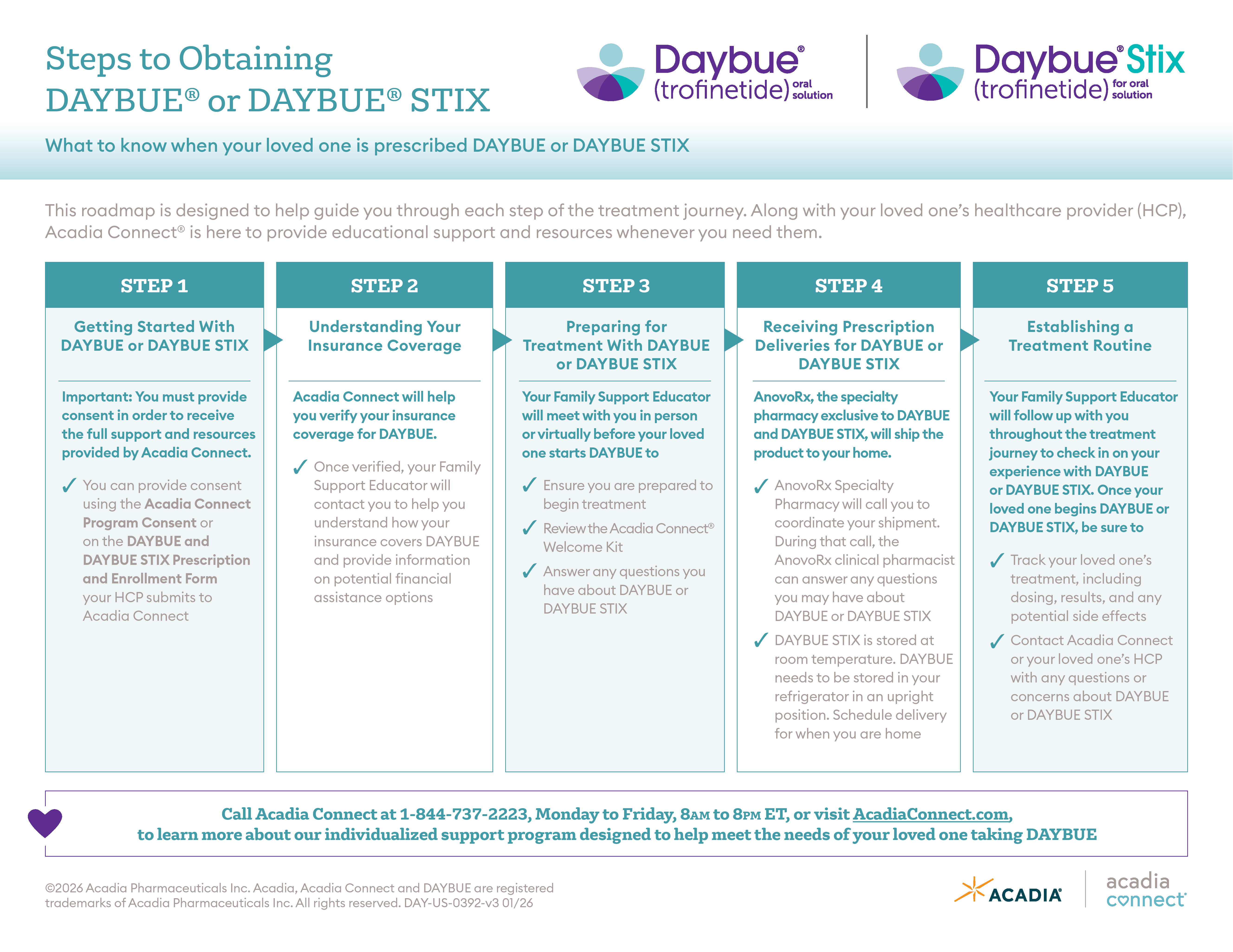 Provides information on getting started with DAYBUE, the patient journey, and how Acadia Connect can help at each step.